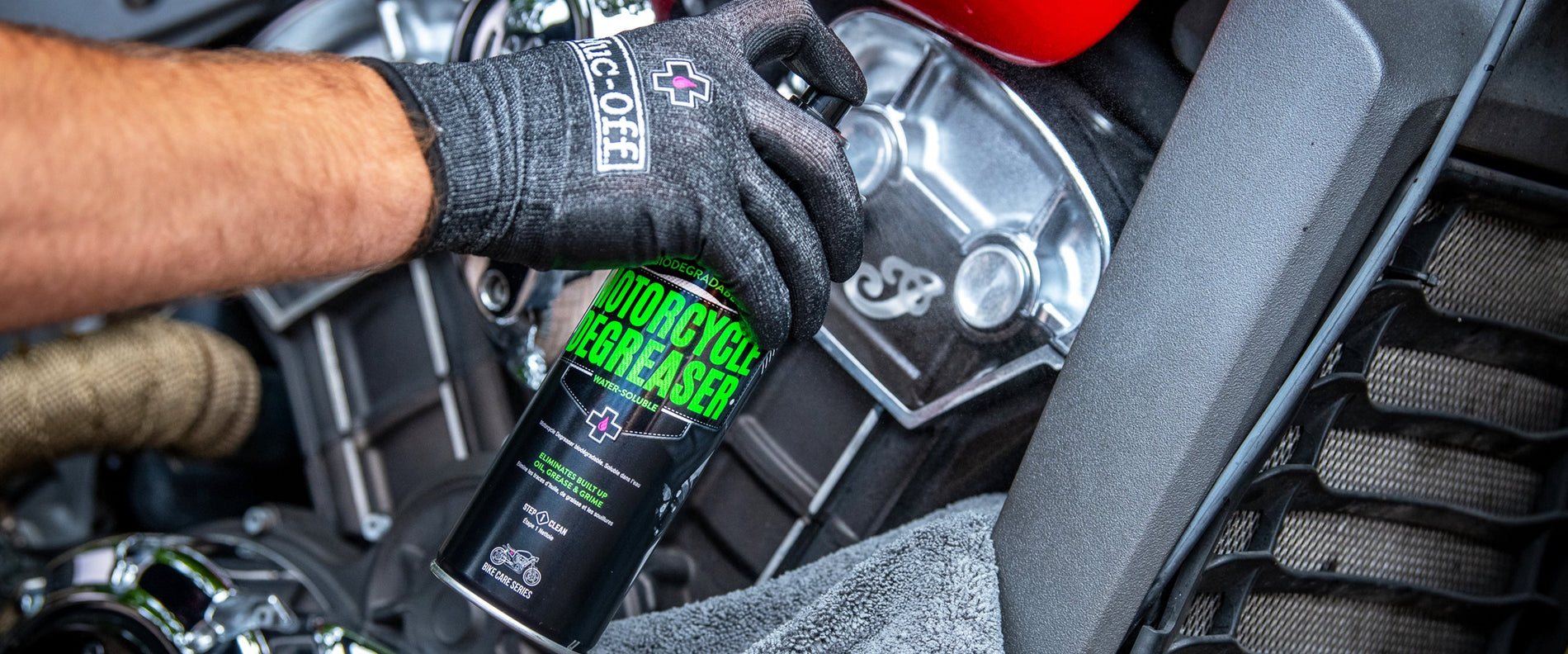 Our Motorcycle Bio Degreaser quickly and safely eliminates built-up oil, grease and grime on metal, plastic, rubber and seals. Its unique, "water soluble" formula means that after use it can be quickly rinsed away with water to leave your greasy bike parts completely clean. Our R&D team put in the hours to make sure this Water Soluble Degreaser works on even the toughest of grime including waterproof grease and chain lube/wax residue!